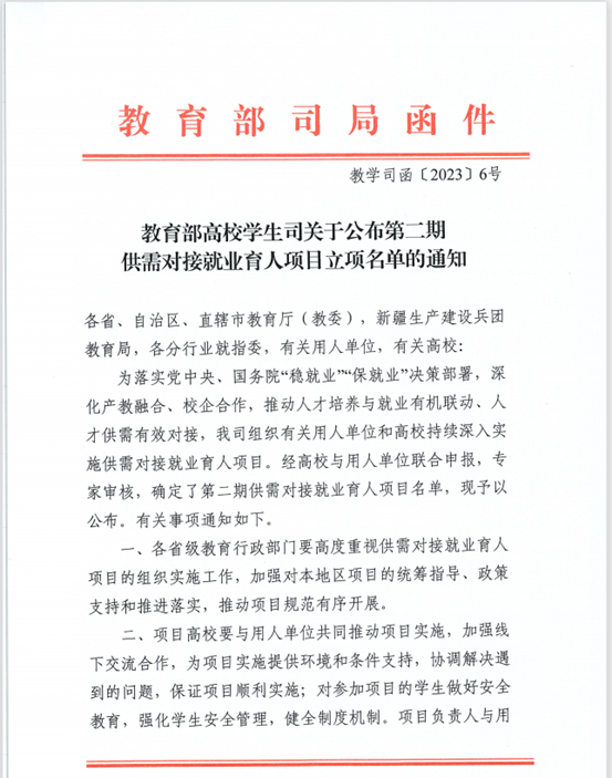 近日,教育部高校學(xué)生司發(fā)布了《關(guān)于第二期供需對接就業(yè)育人項目立項名通知》(教學(xué)司函(2023]6號),經(jīng)高校申請、用人單位申報、專家審核、立項單位信息核查等環(huán)節(jié),我校9001cc金沙與河南慧算賬企業(yè)管理咨詢有限公司聯(lián)合申報的“定向人才培養(yǎng)培訓(xùn)項目”,獲批確定為教育部高校學(xué)生司第二期供需對接就業(yè)育人項目。