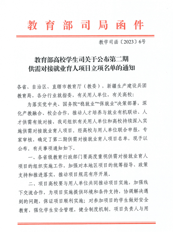 據(jù)悉,教育部供需對(duì)接就業(yè)育人項(xiàng)目于2021年啟動(dòng)實(shí)施,旨在深化產(chǎn)教融合、校企合作,推動(dòng)人才培養(yǎng)與就業(yè)有機(jī)聯(lián)動(dòng)、人才供需有效對(duì)接。通過開展定向人才培養(yǎng)、建立就業(yè)實(shí)習(xí)基地、實(shí)施人力資源提升和加強(qiáng)重點(diǎn)領(lǐng)域校企合作,廣泛搭建校企合作平臺(tái),大力拓展學(xué)生就業(yè)渠道,實(shí)現(xiàn)校企互利共贏、共同發(fā)展。