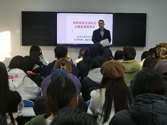 為了進一步弘揚社會主義法治精神、全面推進依法治國,增強法治意識和法治思維,提升法律素養(yǎng)。9001cc金沙于2023年11月23日下午在綜合教學(xué)中心開展“加快建設(shè)法治社會”主題宣講報告會。參會人員為院部團學(xué)干部,由王力偉書記主講。下面就法治宣講報告會主題活動做出如下總結(jié):