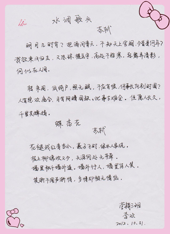 2012年10月31日,由經(jīng)管系團(tuán)委舉辦,經(jīng)管系全體學(xué)生參與的第三屆硬筆書法大賽圓滿成功。在眾多參賽的作品當(dāng)中,其中兩幅作品在該次大賽中脫穎而出,被各位評(píng)委老師評(píng)為優(yōu)秀作品。在此次活動(dòng)中,不僅展示了我系學(xué)生多姿多彩的一面,就如他們的作品一樣,筆尖的剛勁,詮釋了他們對(duì)生活的領(lǐng)悟和執(zhí)著;而且從他們的作品字里行間中散發(fā)出一種青春的詩意。